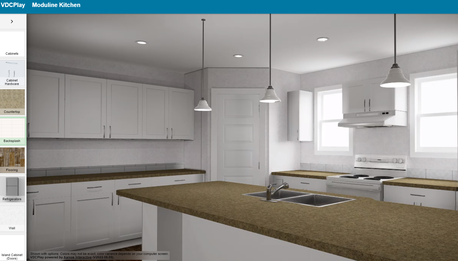 To get a feel for some of the customization options available, you can use our design tool to see what your new home could look like. You can customize the finish of a sample kitchen (backsplash, flooring, cabinet finishes and hardware, etc.) or sample exterior (roof type, exterior paint color, window frames, roof pitch and more), moving the 3-D object around and selecting different options from the left hand side of the screen.